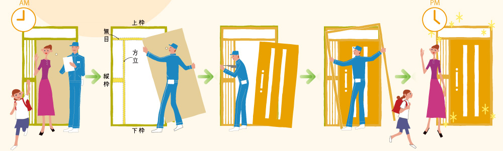 ご指定の日に工事開始。まず、古くなったドアやガラス、袖飾りなどを取り外します。