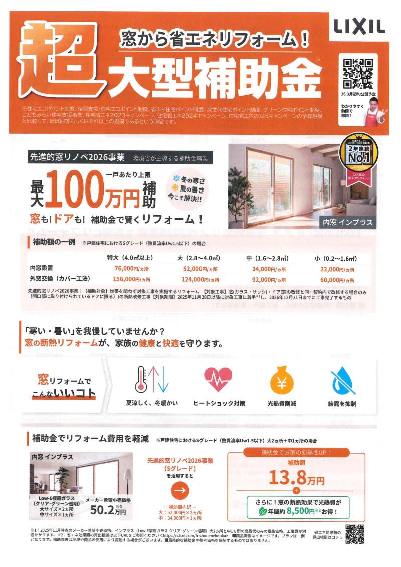 先進的窓リノベ2026事業 大型補助金がスタ-トしました!!