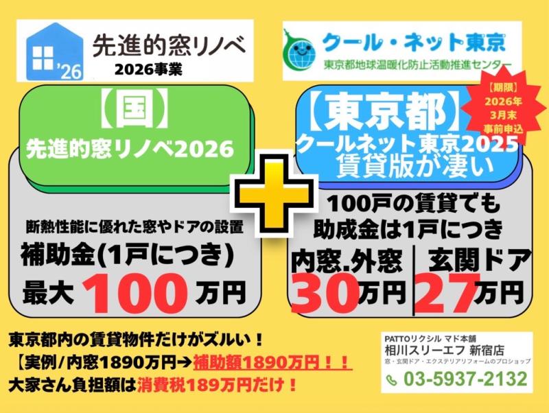 2026年|東京都賃貸マンション|内窓と玄関ドアの補助金|内窓実質無料が継続