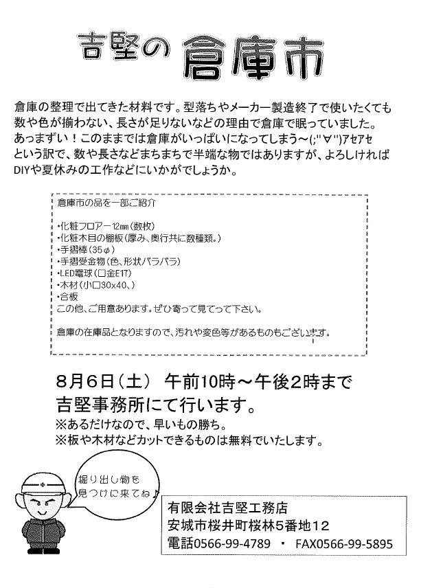 安城市の工務店様 (有)吉堅工務店様の事務所にて 8月6日(土)午前10時から午後2時 倉庫市が開催されます。 掘り出し物を探しに、ぜひ足を運んでみて...