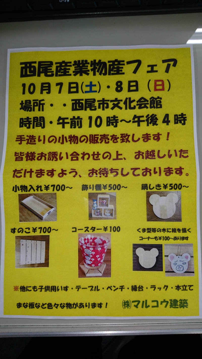 こんにちは! 10月7日(土)10月8日(日)の2日間で 西尾市文化会館にて 西尾産業物産フェアを行います! 西尾のマルコウ建築さんが手作りの小物販売...