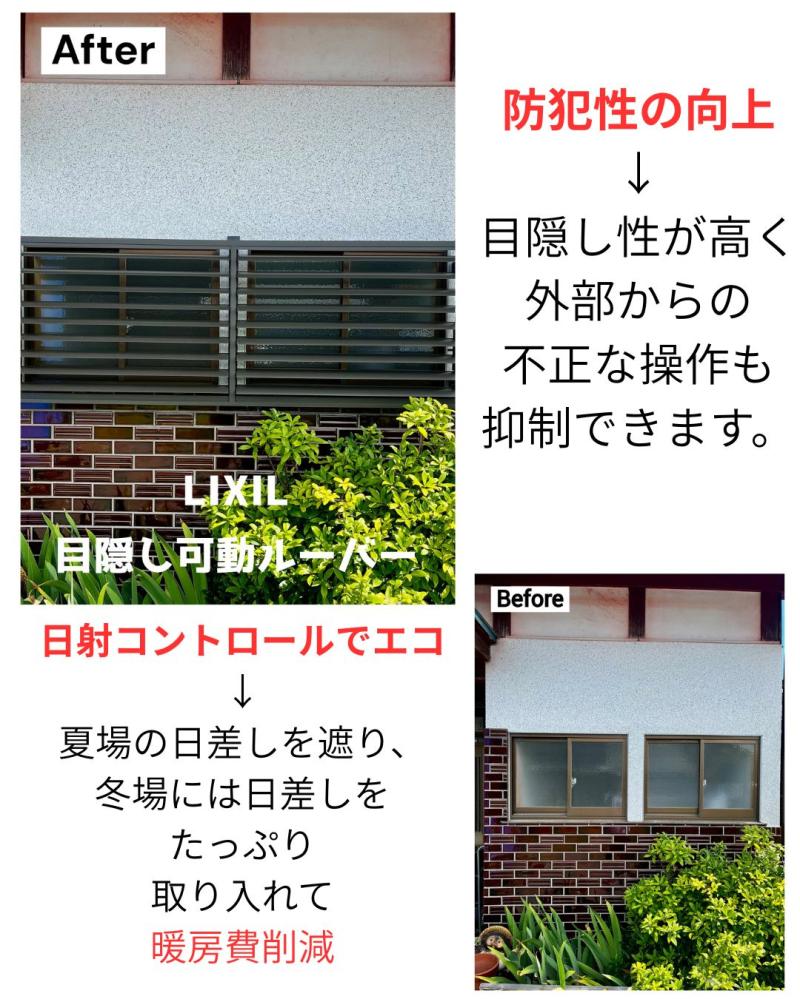 滋賀県高島市でLIXILの目隠し可動ルーバーを取り付けさせていただきました。 面格子とは違い羽根の部分を開閉できます。 開けることで採光・通風効果があ...