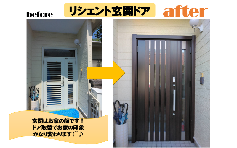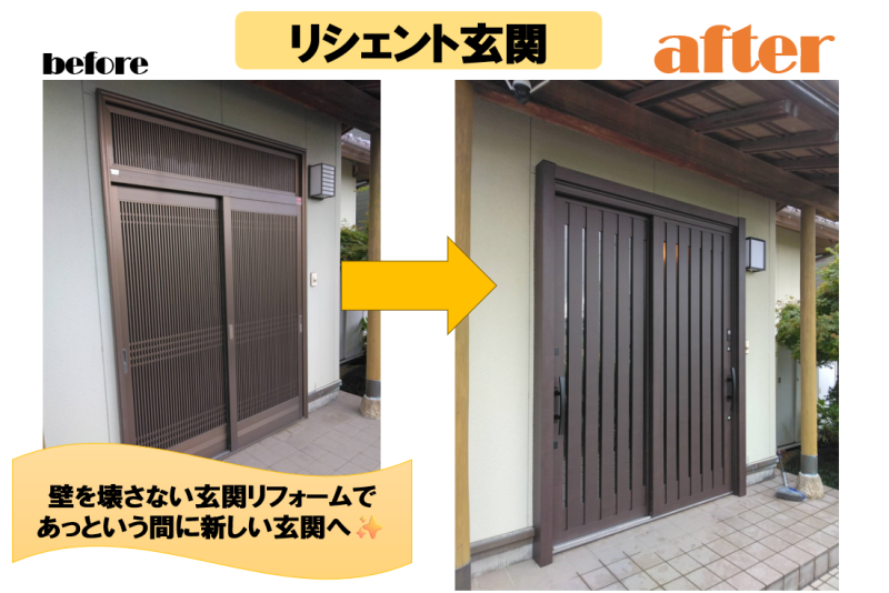 みなさんこんにちは(^^♪ 本日はLIXIL リシェント玄関ドアの 施工例をご紹介いたします! 施工前 ⇩ 施工後 リシェントなら、 壁を壊さず1 日...