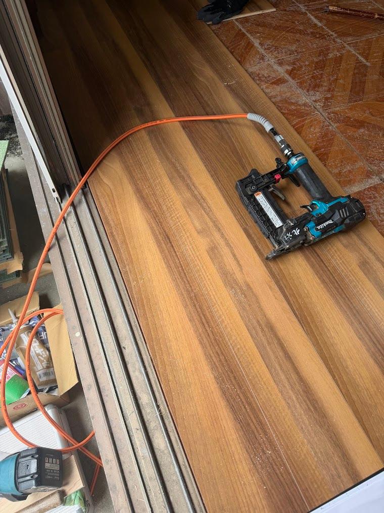 古くなった床で所々ふわふわ・・。 補強してからフローリング張りに・・。 施工中の写真 既存のフロア材の上から下地の根太に向けてくぎを打って補強してから...