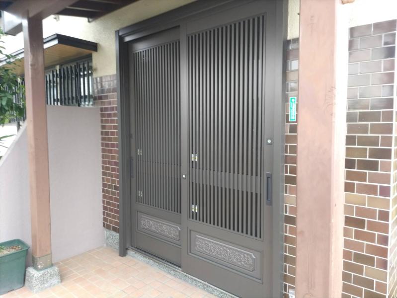 こんにちは。 先日、玄関引戸のリフォーム工事をさせて頂きました。 リシェント玄関引戸2 SG仕様手動2枚建戸ランマ無S6 0型 【特注】 ブロンズ艶消...