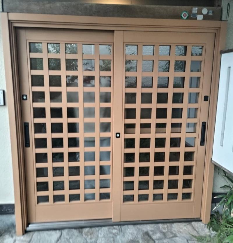 木の玄関をアルミにしたいとのことで 取り換え工事をさせていただきました。 LIXIL リシェント玄関引戸 P25型 槇調 かぶせて取り付ける玄関ですの...