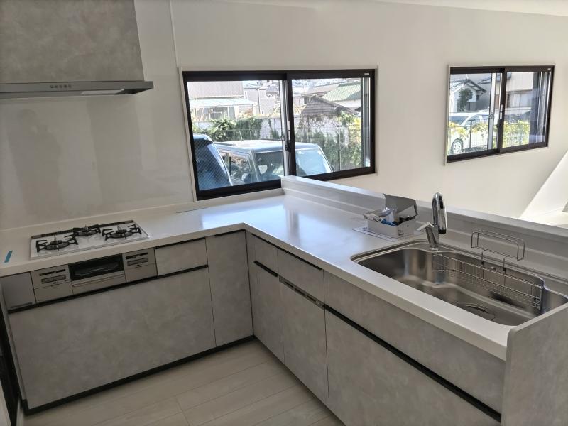 対面キッチンI型のペニンシュラタイプをお考えでしたが 側面に窓があり換気扇が窓にかかって取付できません どうするか思案の末、L型にして納めることになり...