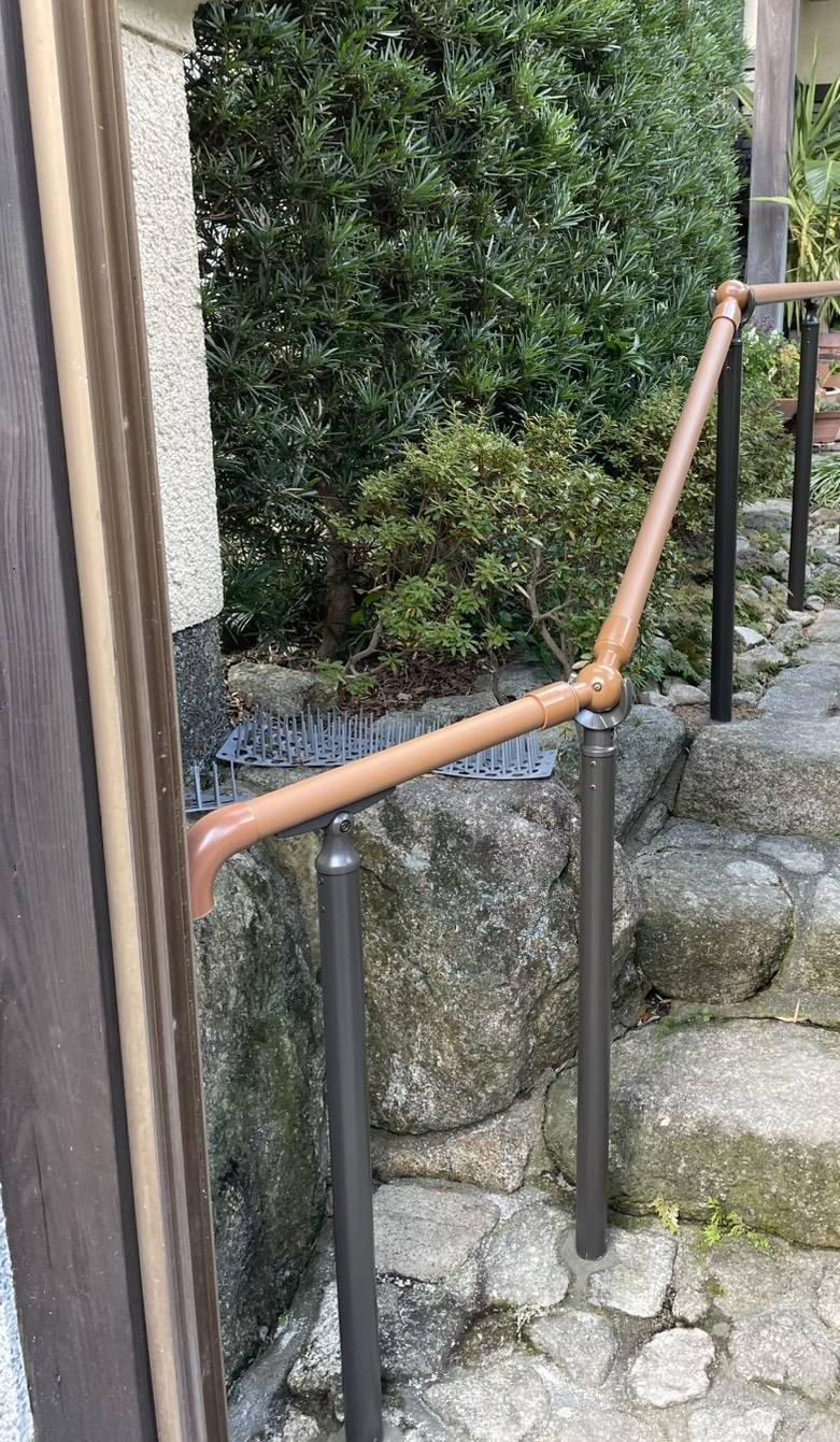 玄関の階段に手すりを施工させていただきました。 LIXIL グリップライン 38⌀樹脂タイプ:S-TOEXブラウン色 埋込柱:オータムブラウン色 石...