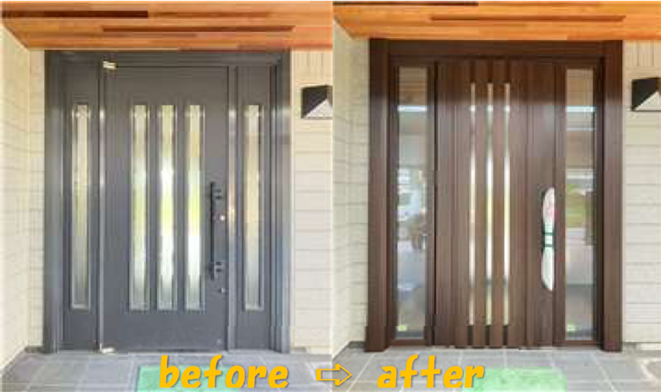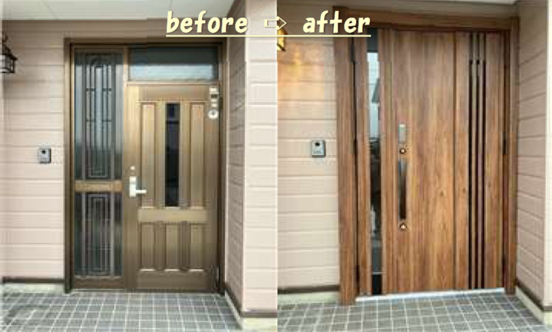 先日彦根市で玄関引戸の取替工事を行いました。 リシェント玄関引戸2 S53型 品種タイプ:SG仕様 枠呼称:2枚建戸ランマ付 障子色:檜調(EN) エ...