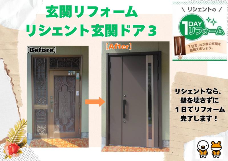 今回は玄関ドアのリフォーム工事をさせていただきました。 ご依頼いただき誠にありがとうございました。 リシェント玄関ドアなら、壁を壊さず1日でリフォーム...