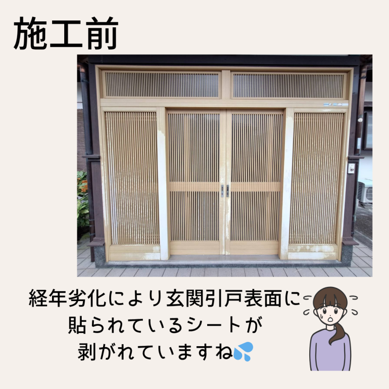 こんにちは♬ 今日はリシェント玄関引戸の 施工事例をご紹介します✨ 施工前は、玄関引戸に貼られている シートが剥がれていますよね💦 経年劣化や雨風に...