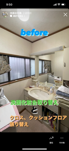 《リフォーム工事》 ~洗面化粧台の取り替え・クロス、クッションフロアの張り替え工事~ 洗面化粧台の水栓が固く動きも悪くなってしまったので、 洗面化粧台...