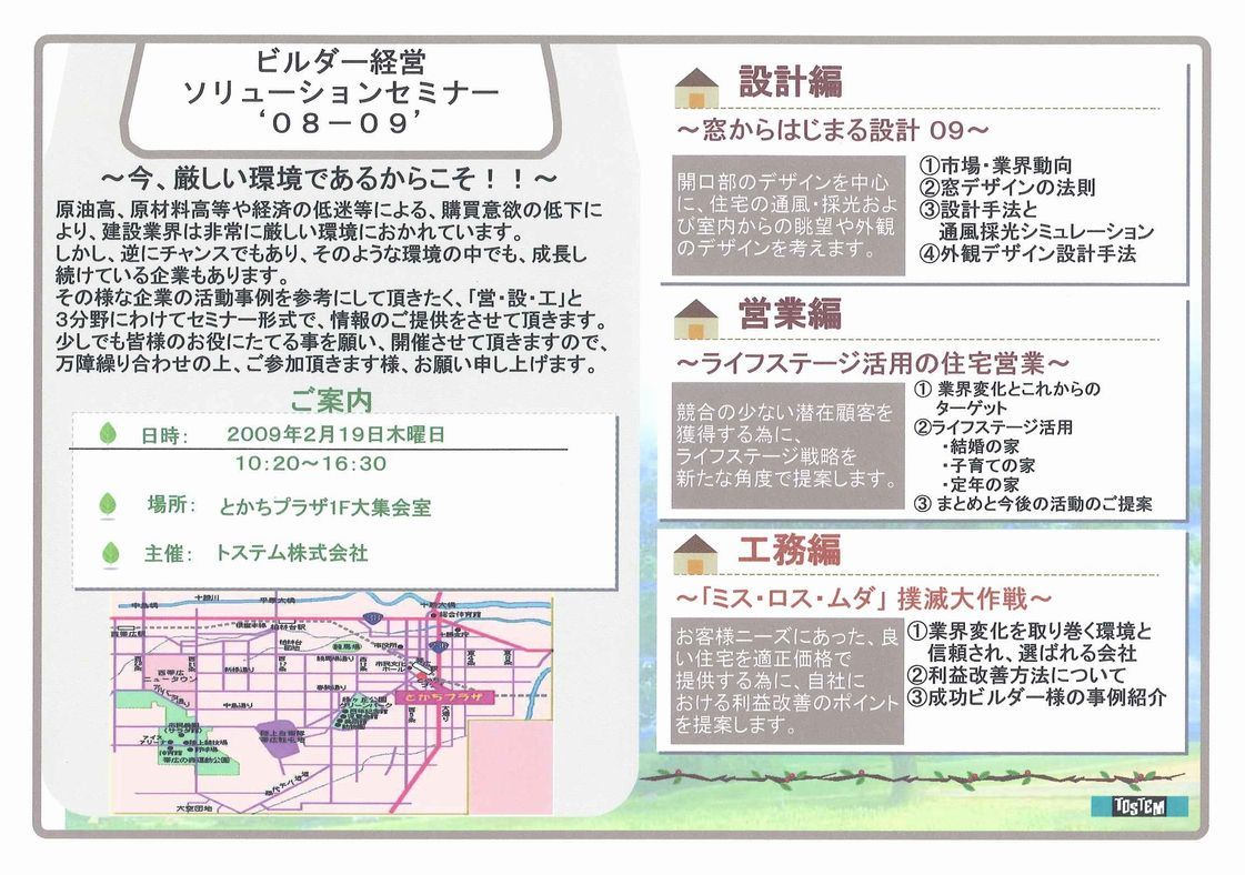 *建設会社様向けのセミナーのご案内です トステム主催による ビルダー経営ソリューションセミナー ‘08−09’ 毎年大変多くの...