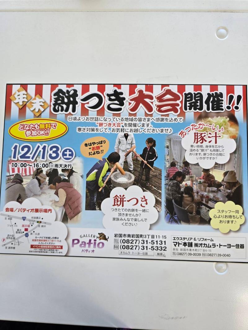 イベントのご案内です♪ 毎年恒例の餅つき今年も開催致します(●^o^●) 12/15(土) 10:00〜16:00 ※雨天決行 展示場パティオにて開催...