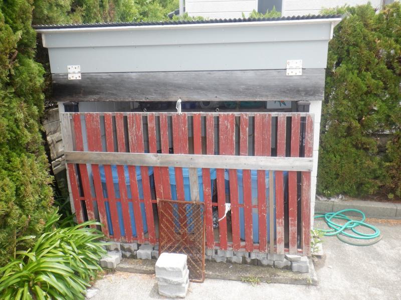 <館山市内> 某施設、ゴミ置場に両開き門扉を設置しました。 (施工前) 既存木製戸がありましたがブロック等で押さえている状況でした ...