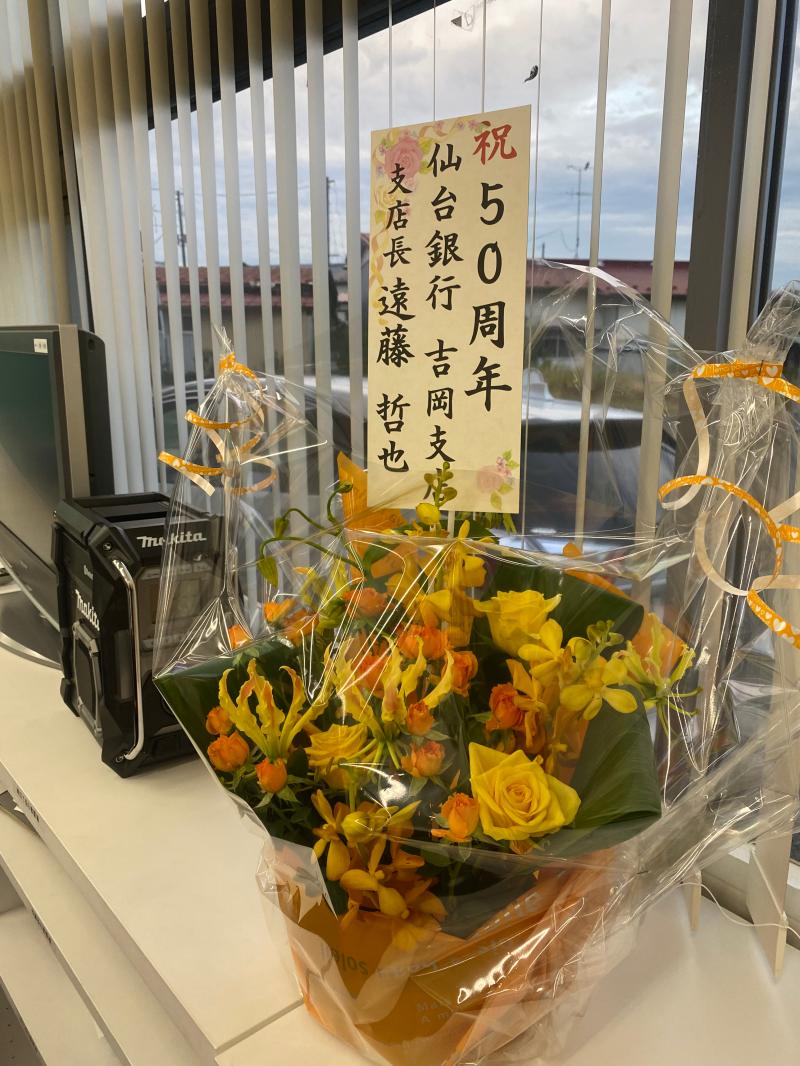 おばんです!高倉です! 9月27日にトーヨー住器が50周年となります! 今回仙台銀行様からお花頂きました! ありがとうございます!! 皆様に支えられて...