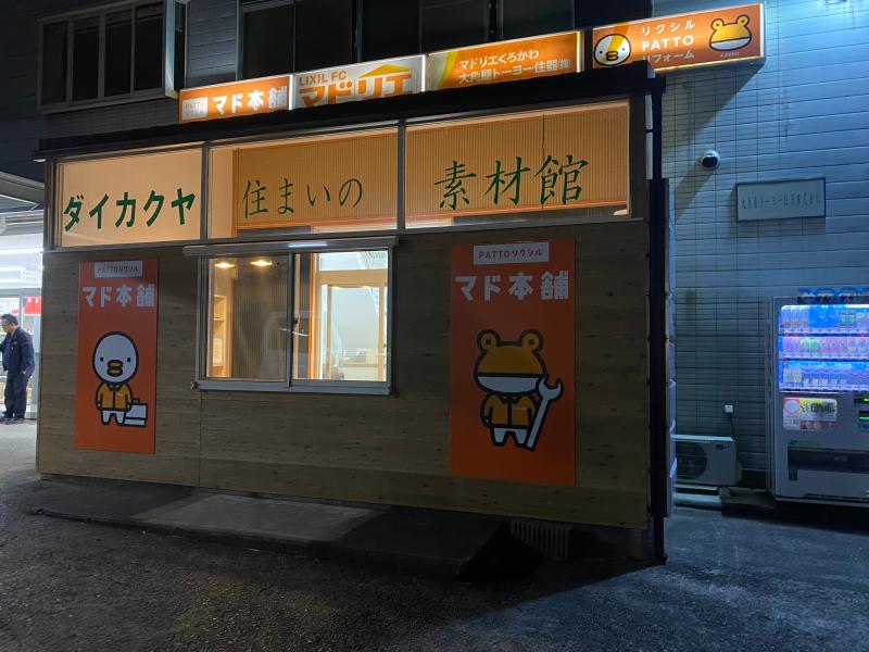 おばんです!高倉です! ダイカクヤの正面入り口がトリ、カエルが登場! 現場から帰って来たら変わっててびっくり!! リクシルのマスコット、トリとカエルは...
