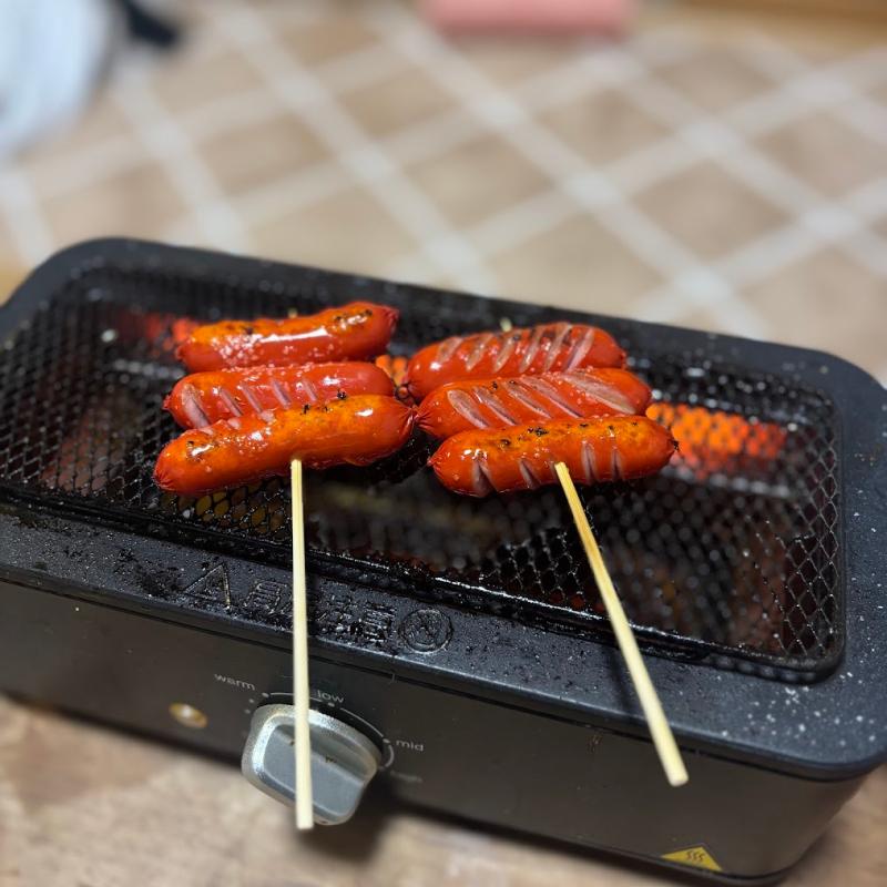 自宅でヘビーに使ってるのが電気七輪なんですが・・。 豪華な食材ではなくこんなシンプルな赤ウインナーソーセージに切り目入れて串にさして焼くだけのおつまみ...