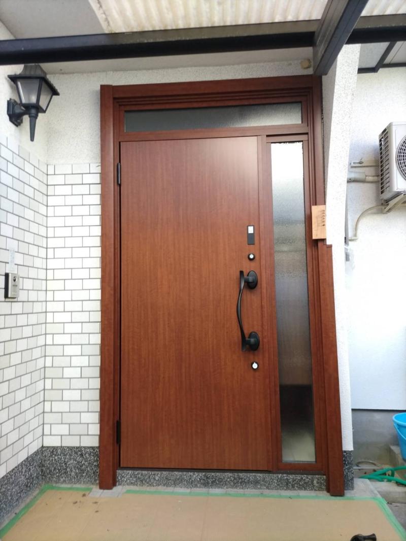 玄関ドアのリフォームをさせていただきました。 LIXIL リシェント玄関ドア3 断熱仕様 電池錠 片袖ランマ付L M17型 ポートマホガニー色 アルミ...
