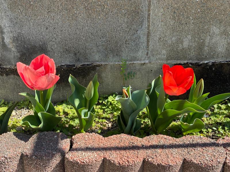 こんにちは。事務のマツジムです。 お取引様にいただいて、冬場に植えたチューリップの球根が咲きました。 微妙に赤の色が違ってかわいらしいです。 花が咲く...
