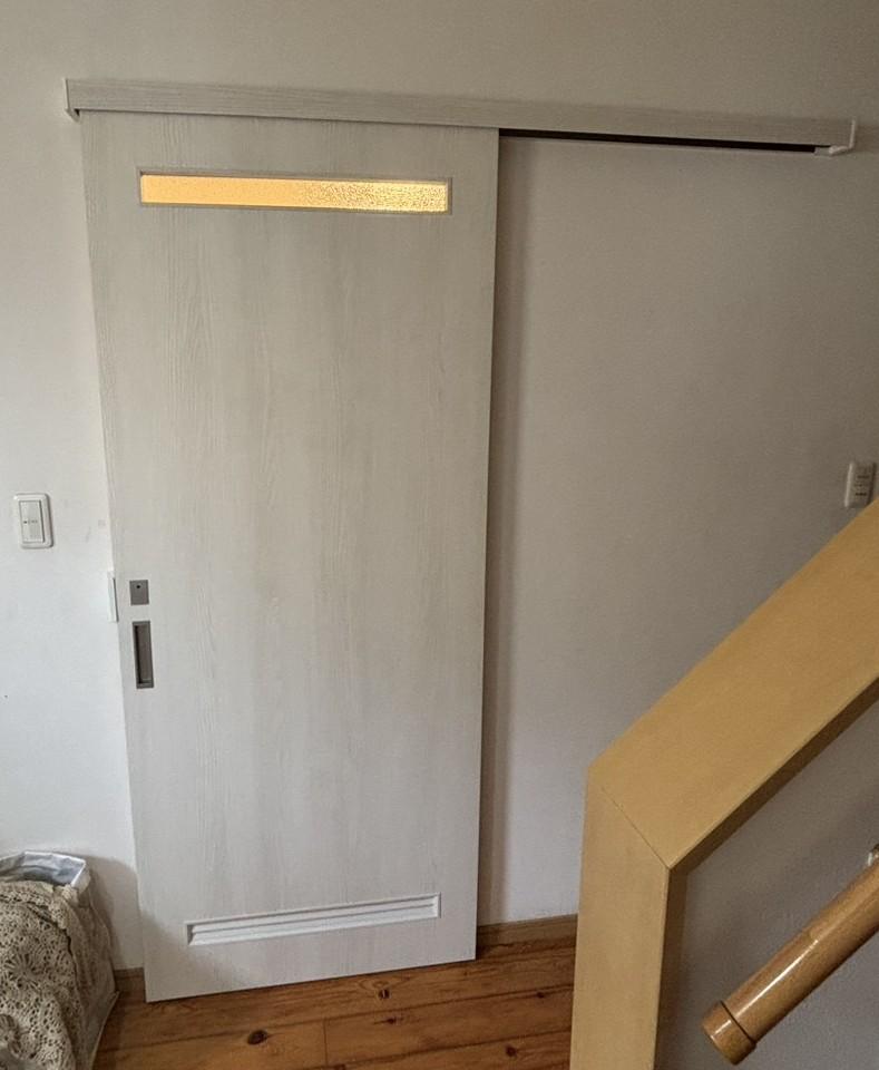 古くなった建具を取り換えたいとの事で アウトセット(外引き)片引戸を 取付させていただきました。 既設の扉をはずし、上にレールを取付、 本体建て込みに...