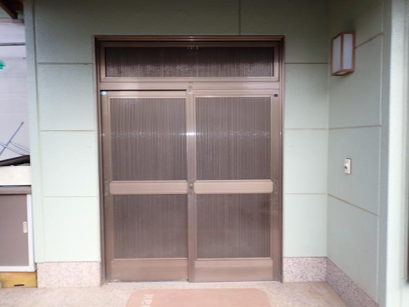 玄関のガラス部分から冷気が入り、防犯面も不安というご相談でした。 ガラス面が大きく、断熱性・防犯性ともに不安の残る状態でした。 【施工中】 カバー工法...