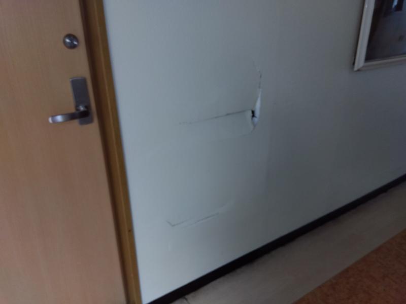 こんにちは、宮本です。 今日は昨日終わりました壁修繕工事のご報告をさせていただきます。 廊下の壁に穴が開いてしまいました。 写真では判りませんが、下の...