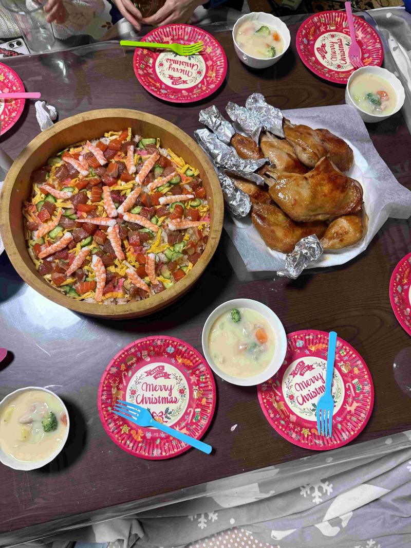吉川家のクリスマス会 息子のリクエストで今年は、 【ちらし寿司】 【シチュー】 【チキン】 もちろん【ケーキ】も忘れずにね
