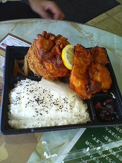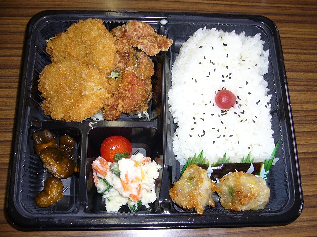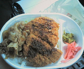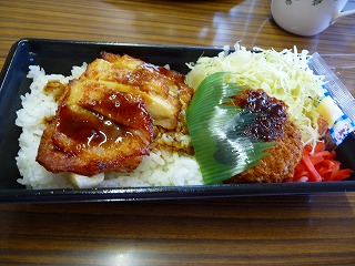 かまど家さんのお弁当 チキメン丼 甘辛の照り焼きチキンとメンチカツのお弁当です キャベツの線切りと紅しょうがが付いて ...