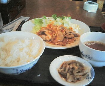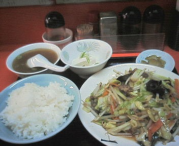 とある定食屋さんの野菜炒め定食です。内容はご飯、冷奴、野菜炒め、スープ、ザーサイの5点セットでボリューム満点な昼でした。