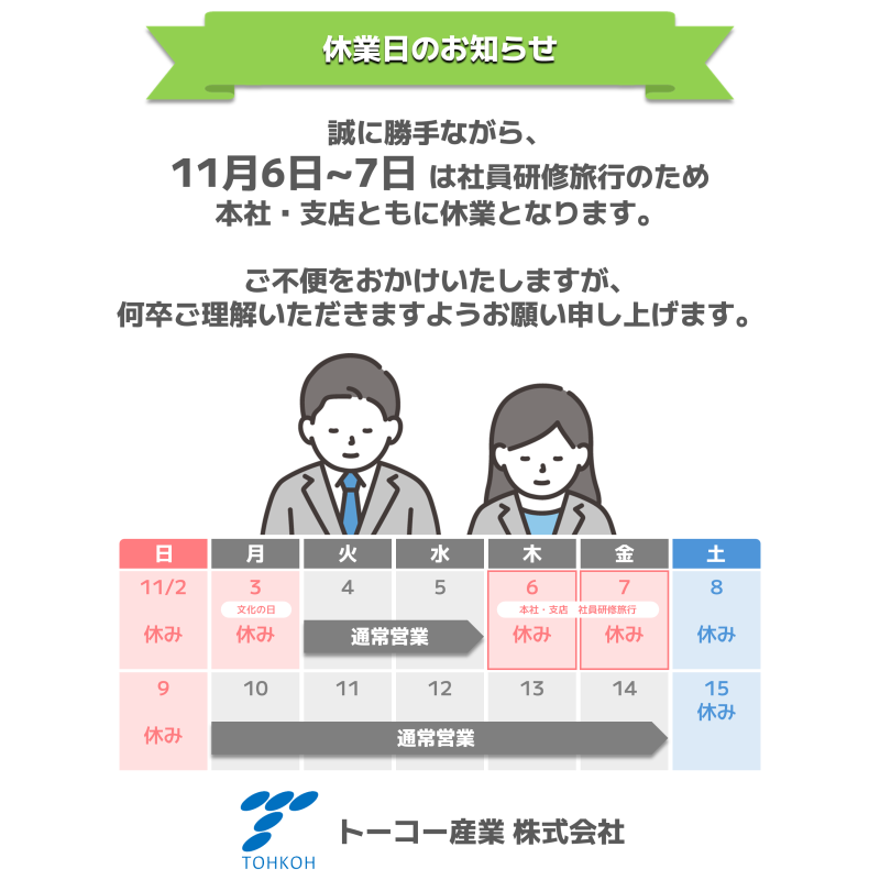 ■ 11月 休業日のお知らせ ■ こんにちは☀️ トーコー産業です✨ 日頃より弊社をご愛顧いただきまして 誠にありがとうございます🙏 誠に勝手ながら...