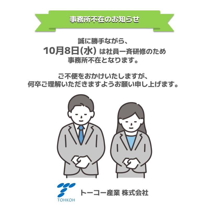 ■ 10月8日事務所不在のお知らせ ■ こんにちは☀️ トーコー産業です✨ 日頃より弊社をご愛顧いただきまして 誠にありがとうございます🙏 誠に勝手...