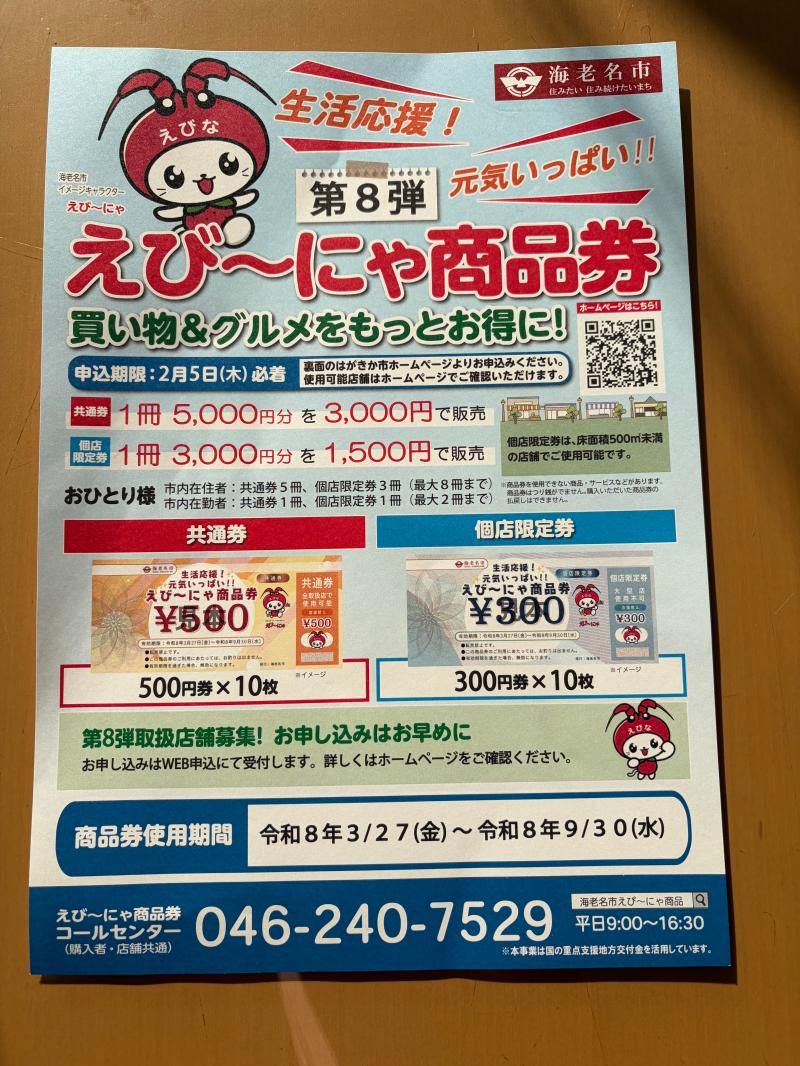 えび~にゃ商品券(第8弾)2月5日までに、商品券の申し込みをお忘れなく!