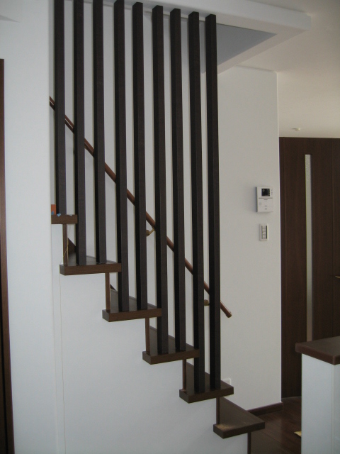 オープン階段の部分に格子調の手すりを取り付けです。 アルミ製とのご希望があり、柿渋調のアルミ角材を使用。 柿渋調色を使用で...