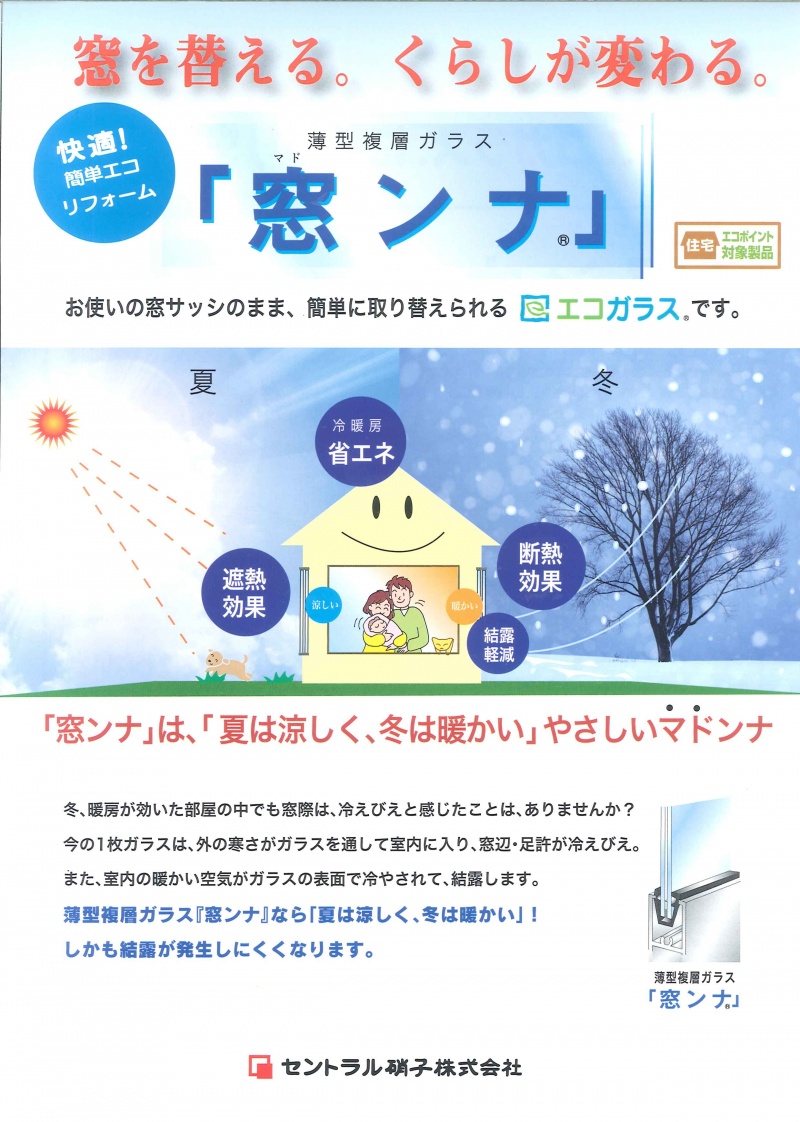 今回ご紹介しますのが、セントラル硝子㈱より販売されている 薄型複層ガラス(複層硝子とは、2枚のガラスで構成されている硝子です) 『窓ンナ』 という商品...